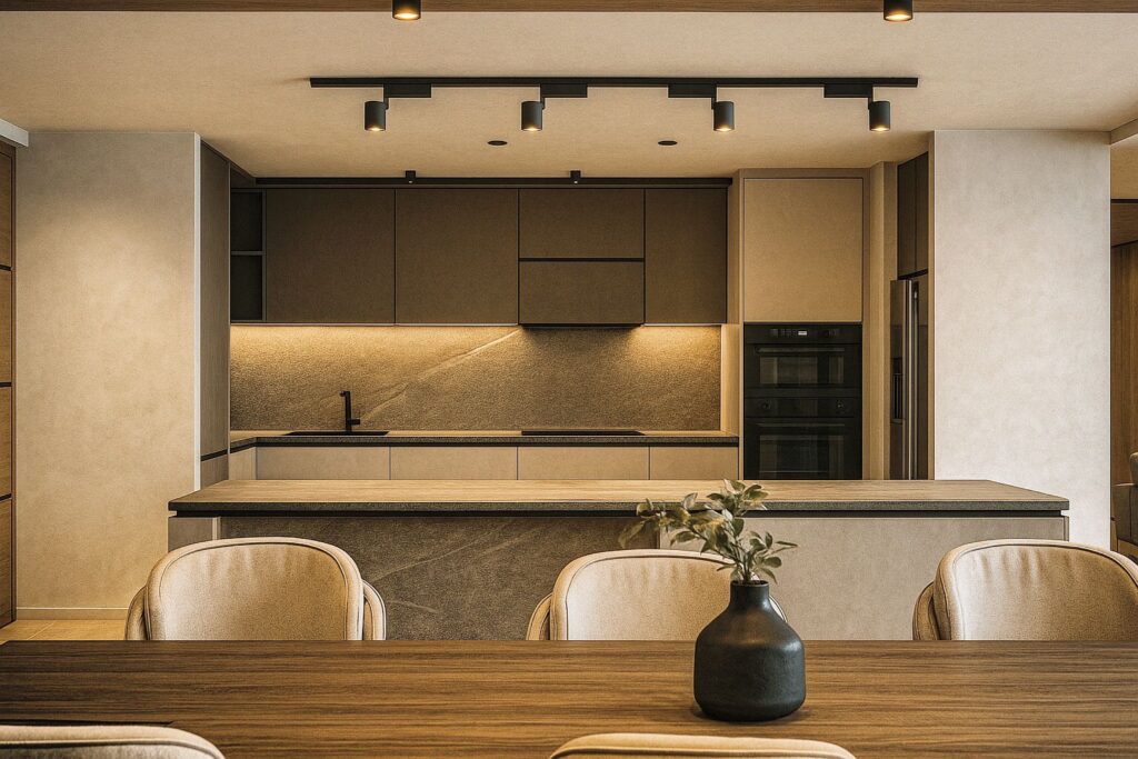 This interior project explores a refined balance between warmth, minimalism, and material sophistication. A neutral palette of soft beige, natural wood, and textured surfaces establishes a calm and timeless spatial atmosphere, while clean lines and integrated detailing enhance visual clarity. Custom-designed furniture, concealed storage, and layered lighting contribute to both functionality and elegance, allowing spaces to transition seamlessly between everyday living and social interaction. Thoughtful material contrasts and subtle spatial zoning create depth without visual clutter. The design prioritizes comfort, proportion, and tactile quality, resulting in an interior that feels contemporary, understated, and deeply connected to modern living.